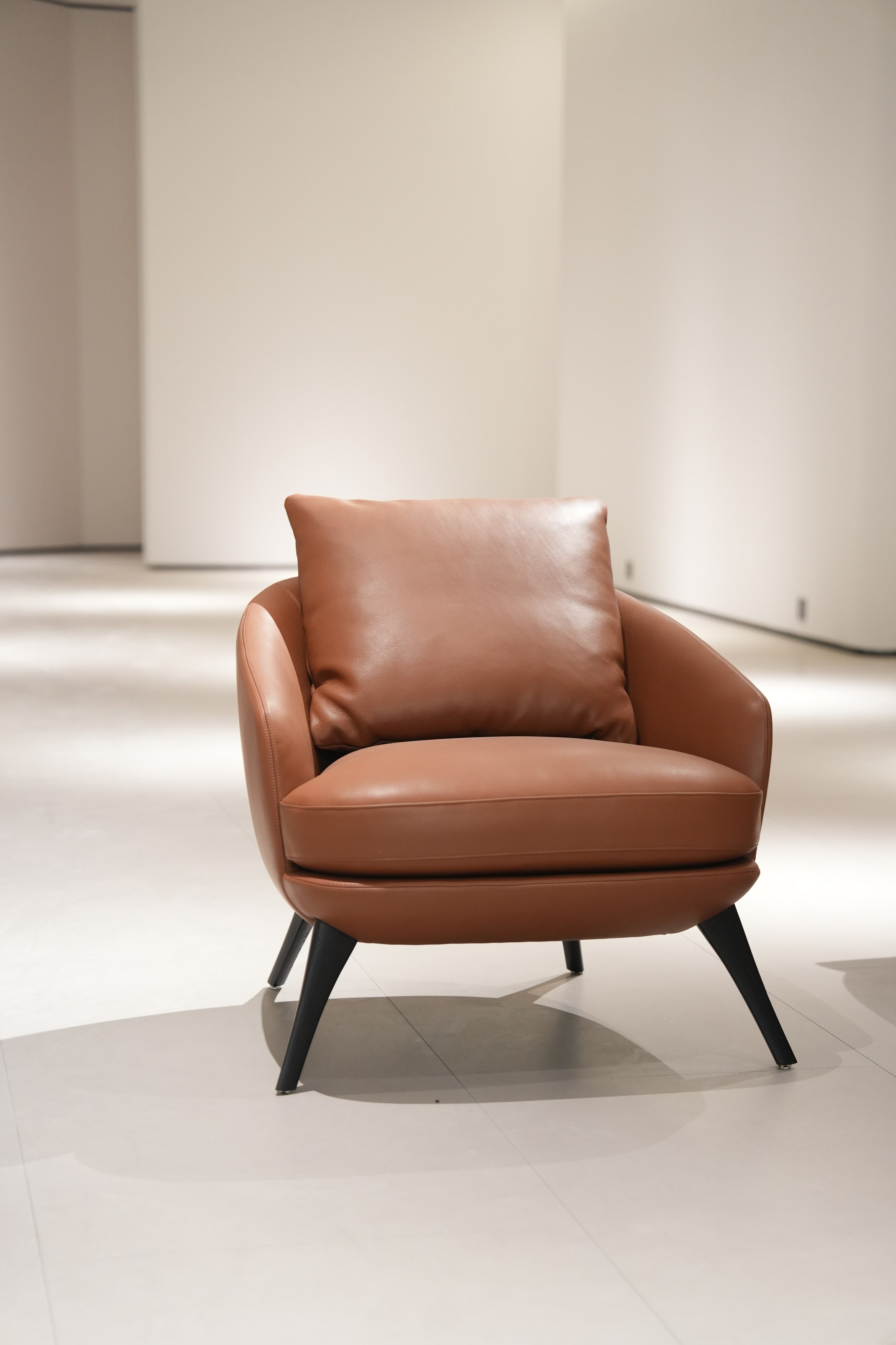 A light brown leather armchair stands quietly in one corner, its lines long and restrained, with a slender metal frame outlining a light silhouette. The deep brown leather surface meets the cool metal, like a communication between materials—quiet and profound. A matching leather cushion rests on the seat, continuing the thread of minimalist aesthetics, gentle and dignified.