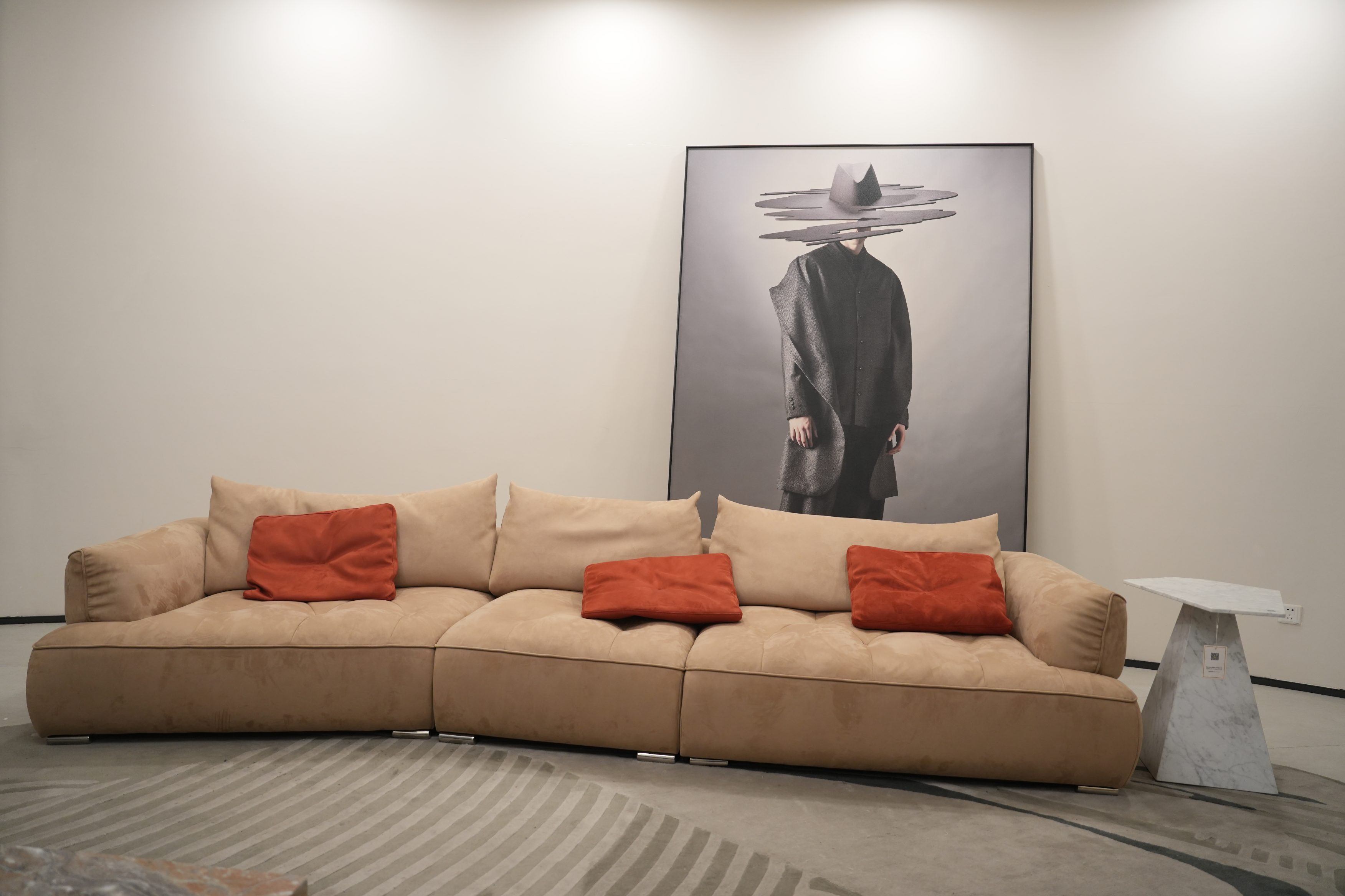 The off-white main sofa unfolds like a blank scroll, accented by a splash of bright orange—like a warm sunbeam—its form full and crisp. This encounter of colors is vibrant and unassuming, gently awakening the space's vitality through restrained design.
