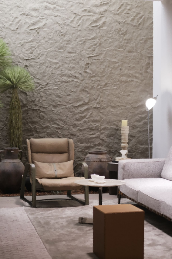 With natural textures and warm tones as its foundation, this space sketches a tranquil and soothing modern minimalist ambience. Walls are clad in expansive light gray stone patterns, revealing naturally formed undulations and mottled hues. It’s as if time has left faint traces here—primitive and pristine, exuding a quiet power without a word.