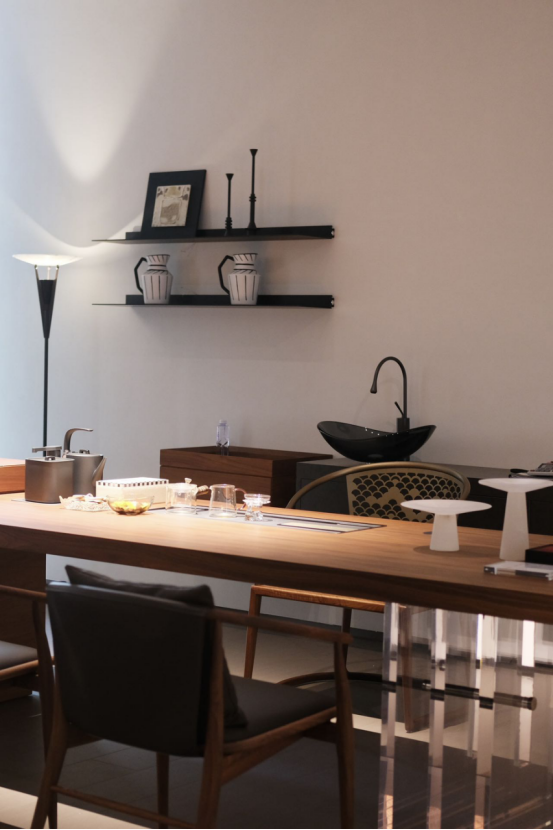 The chairs by the table each possess their own character—dark leather and wooden frames complement each other beautifully. The one on the right, adorned with a subtle gold fish-scale openwork carving, adds a quiet accent, creating a delicate ripple of refinement against the clean backdrop.